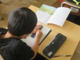 国語の学習です。めあてをノートに書いた後、定規を使って赤鉛筆で囲っていました。去...