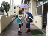 雨の中、登校してきた子どもたち。 保健室前で楽しそうな声が聞こえたので覗いてみる...