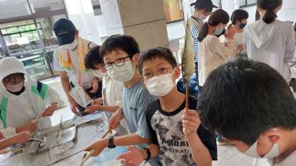 自分でつかまえた鮎を、自分で串打ちまで行いました。上手に焼いてもらい、美味しくいただきました。