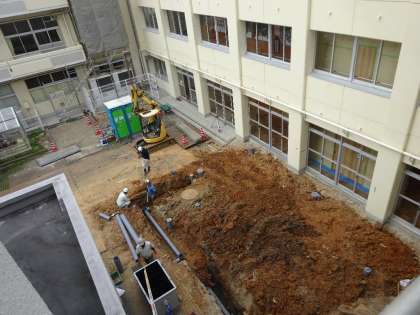 夏休み中、バリアフリー化工事の1つである、エレベータ工事が進んでいます。現在は、エレベーター棟の基礎部分が進行しています。また、北舎東側トイレの工事も、同時に進んでいます。