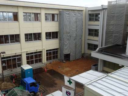 8月16日現在のエレベーター工事の様子です。いよいよ、足場が組まれました。