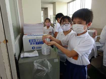 手指消毒や黙食など、子どもたちは感染予防をしっかりとしながら給食の準備から片付けまで行っています。まだ、感染者数は少し減少傾向ですが、高止まりしています。感染予防をしっかりと行っていきます。