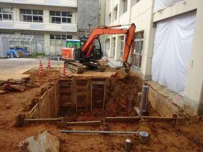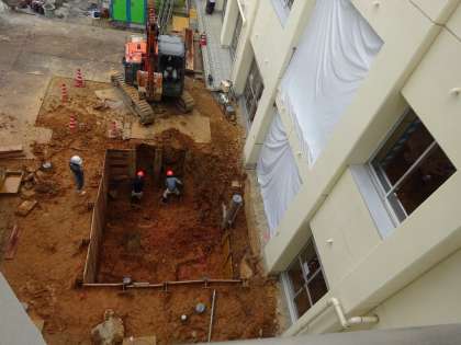 9月9日(金)エレベーター工事の様子です。地面を掘り基礎部分の工事が進んでいます。