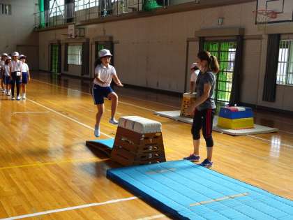 今年度も「特色ある学校づくり推進事業」で、体力向上補助指導員を依頼しています。担任と一緒に、跳び箱の指導を行いました。