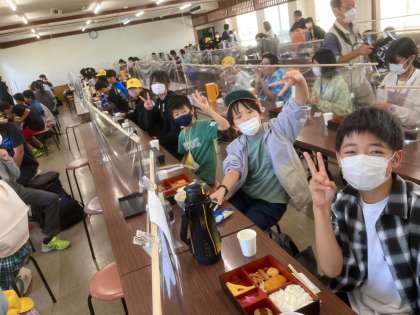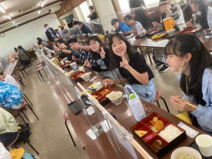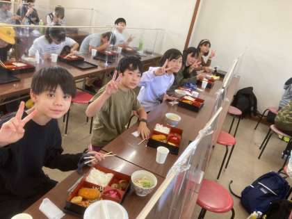 6年「修学旅行」法隆寺の見学後、昼食を食べました。楽しそうな笑顔が見られます。