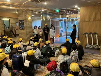 朝食後、チェックアウトし、お世話になったホテルの方々に全員でお礼を伝えています。