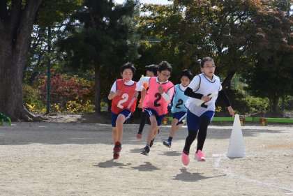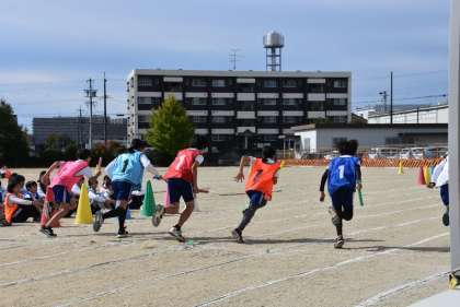まずは「全員リレー」です。全員でバトンをつなぎます。各学級2チーム、全6チームで競います。日々、自分たちの記録と闘っています。