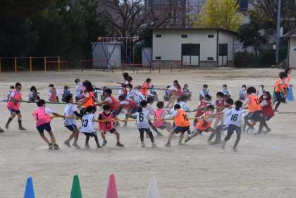 綱引きではなく、「綱取り」ならんでいる複数の綱を取り合います。全学級総当たりで競います。