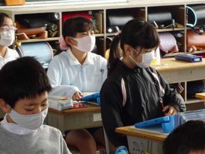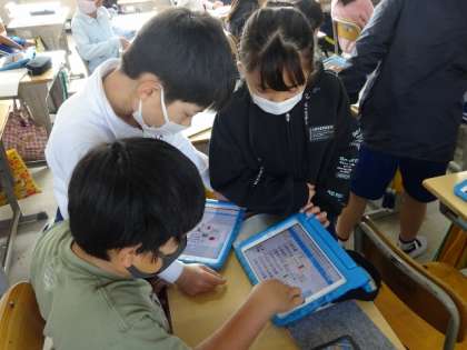 副教材「とよた」を用いながら、学習用タブレットのスカイメニューを用いて、クイズ形式で考えていました。今後、学校内の防火施設を探しながら、学習を続けて行きます。