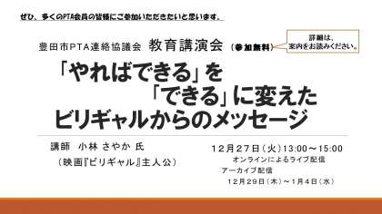 豊田市PTA連絡協議会 教育講演会(参加無料)のご案内です。