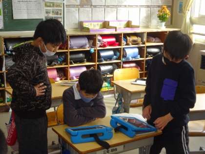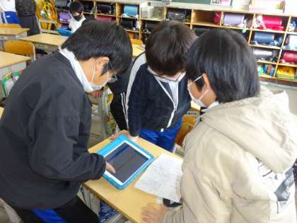 現在、手紙を書く相手のことを各学年に説明してから書いてもらうために、ボランティアの方や見守り隊の方のことを調べたり、直接インタビューしたりしています。この後、学習用タブレットを用いてまとめ、完成したものを各学年へ説明し、手紙を書きます。