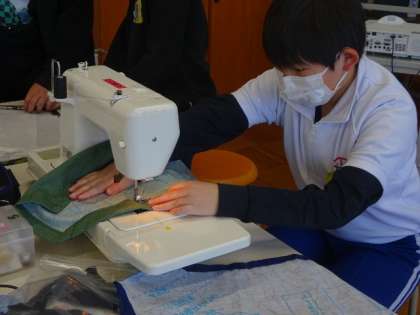 5年生が家庭科の授業で、エプロン作りを行っています。