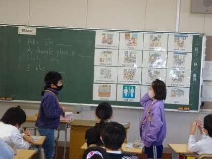学校内の自分の特に好きな場所と理由を英語で伝え合っていました。