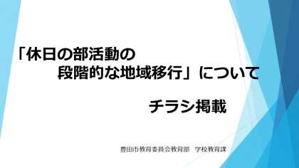 「豊田市は、中学校の休日の部活動の地域移行を推進していきます」というチラシがきました。ご家庭にもお知らせくださいとの案内がありましたので、掲載します。お読みください。