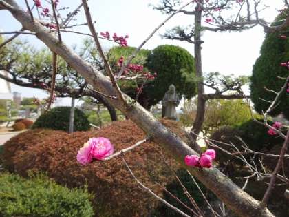 正門を入った、昇降口前の植込みの、梅が咲き始めました。
