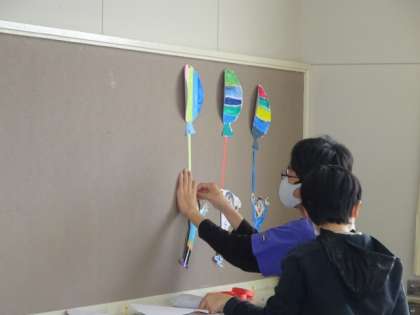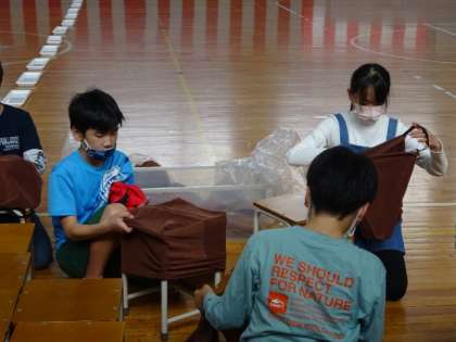 「1年生用の椅子のカバーは、数年前の6年生が卒業プロジェクトで家庭科の先生と一緒に作ったものだよ」と話をすると「大事にしなきゃ」「さすが6年生。あっ僕たちもそうなろう」などと話し、人の良さが出ていました。