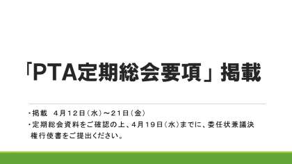 定期総会資料(PTA総会要項)をご確認の上、4月19日(水)までに、委任状兼議決権行使書をご提出ください。