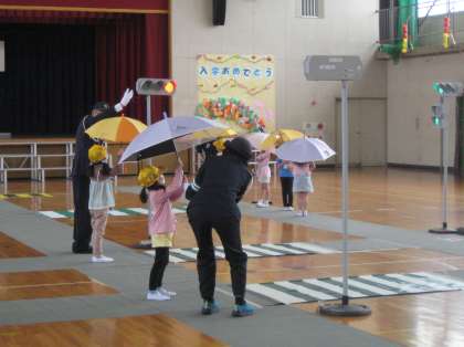 今回は、交通安全協会の方と地域の交通指導員の方の協力を得て、信号機のある横断歩道と、ない横断歩道の歩き方や、踏切の渡り方を教えていただきながら、練習を行いました。また、傘をさした時の練習も行いました。
