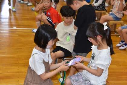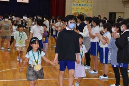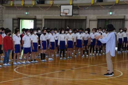 「1年生を迎える会」を行いました。6年生が司会進行を行い、4年生の楽器演奏と共に1年生が入場しました。その後、3年生のダンス、5年生の合唱を行い、2年生が1年生にプレゼントをしました。学年と学年の幕間を6年生がクイズや劇で盛り上げました。