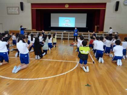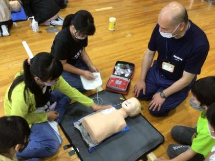 豊田市南消防署末野原分署の方に来ていただき、5年生が心肺蘇生(心臓マッサージ/AEDの使い方)の仕方を学びました。