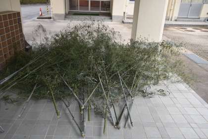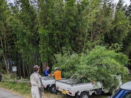 地元の竹林の持ち主の方にも協力いただき、6人で21本の竹を取りました。大林町区民会館の軽トラックと、竹林の持ち主の方の軽トラック2台で、学校まで運びました。
