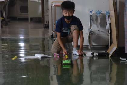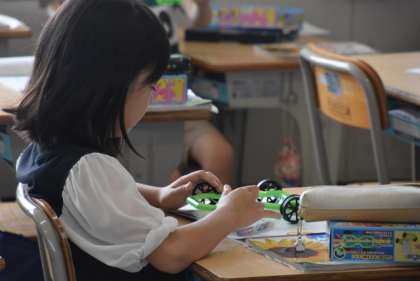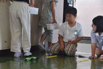 3年 理科「ゴムや風の力」の学習で、教材キットの「ゴムで動く車」を組み立てていました。その後、廊下で、ゴムの伸ばし方と車が進む距離の関係を調べていました。
