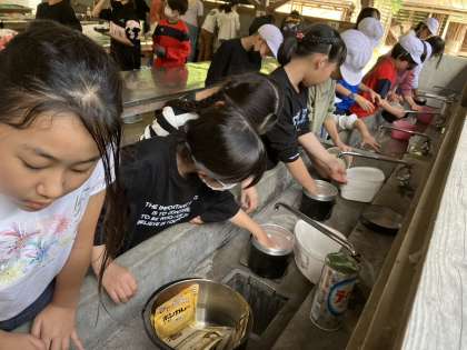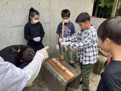 火起こしを行いました。各班、苦戦しながら、協力していました。自分たちで起こした火を使い、野外炊飯を行いました。