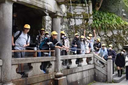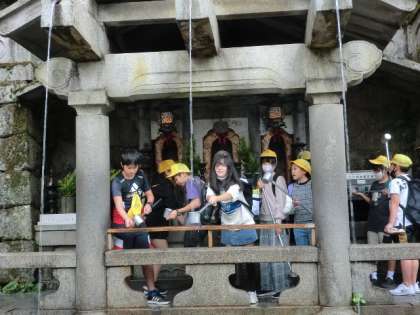 音羽の滝とは、清水寺の寺名の由来となった清水の湧き出す滝で、古来「金色水」「延命水」とも呼ばれ、現在では学業や恋愛成就、長寿にあやかれるパワースポットとして親しまれています。子どもたちは、目的の水を柄杓ですくっていました。