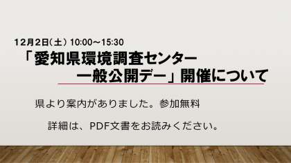 愛知県より「愛知県環境調査センター 一般公開デー」開催についての紹介依頼が来ましたので、掲載します。
