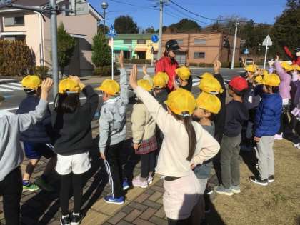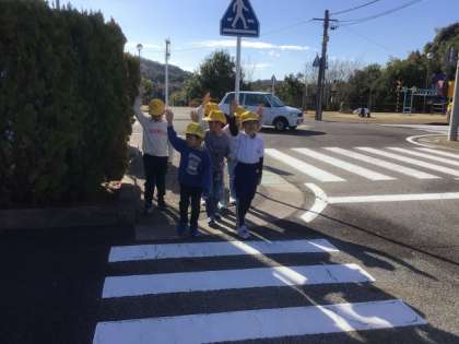 シアターで交通ルールを学んだ後、敷地内で歩道の歩き方や横断歩道のわたり方を学び、練習しました。学んだことを、普段の生活でも実践できるように、学校でも家庭でも声をかけて行きたいものです。
