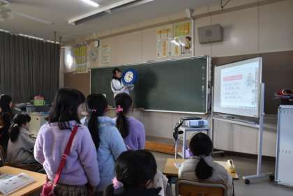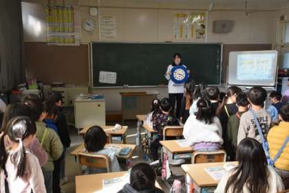 校舎周辺→校舎内の探検を経て、今回は1年生の教室の中に入り、授業を見学しました。園児たちが教室に入ってくると、1年生の子たちも、お兄さんお姉さんの顔をして、いつも以上に背筋を伸ばして授業を受けていました。