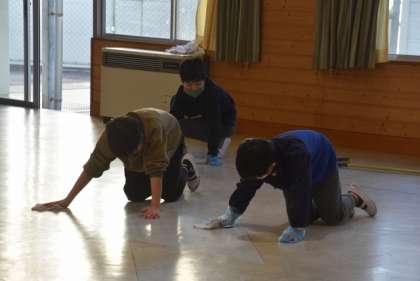 各教室の扇風機カバーや羽の清掃や、配膳台カバー作成、特別教室のワックスがけなどを行っています。