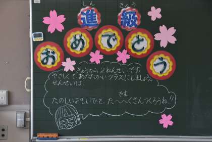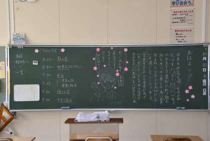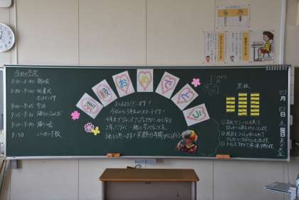 これは、学級で担任たちが前日に準備した「黒板」です。写真が撮れた中から選びましたが、他にも工夫を凝らした黒板がありました。