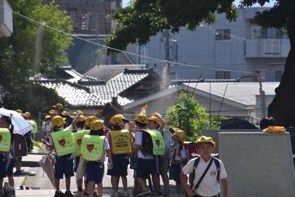 登校時や放課、授業の前後等に、子どもたちは「涼しい」「気持ちいい」と言いながら、ミストを浴びています。