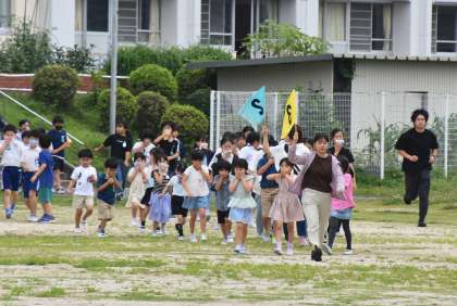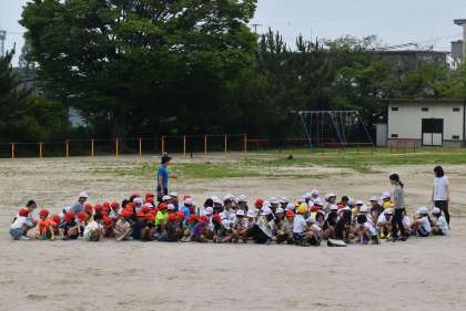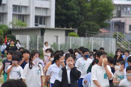今回は、長放課の時間に地震が起きたことを想定し行いました。運動場で遊んでいる子たちは運動場中央に集まり、校舎内にいる子たちは近くの教師が引率し避難しました。