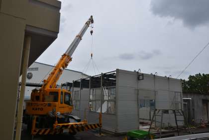 なかよし(放課後児童クラブ)の体育館側のプレハブ解体が、学校閉庁日明け再開されました。