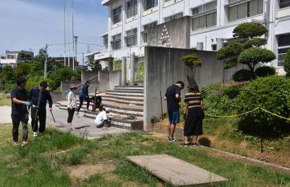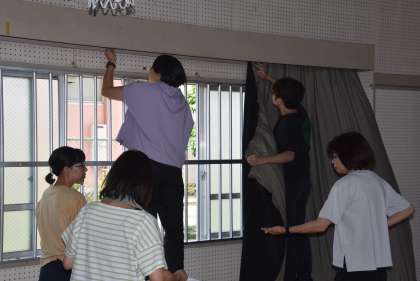 植え込みの侵入禁止を目印として、柵を設置や体育館の暗幕の修理、普段できない不要物の整理等を行いました。