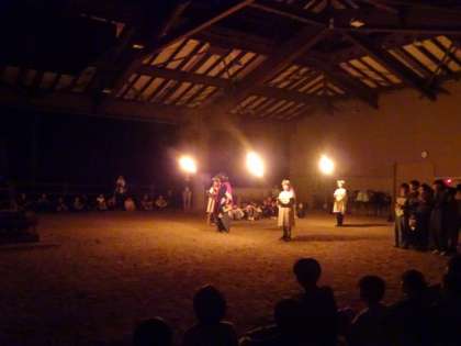 野外炊飯のあと、突然の雷雨があったようで、雨天ファイヤー場での実施でした。