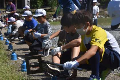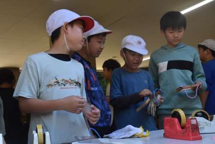 杉板をバーナーであぶり、たわしとぼろ布で磨いたものに絵や文字を書き、ひもを付けました。それぞれが、思い出に残った絵や文字を入れ、集中して作業していました。