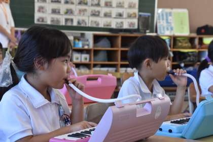 講師をむかえ、1年生が鍵盤ハーモニカ講習を行いました。