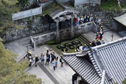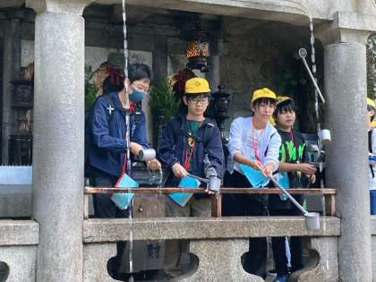 グループ別行動で、清水の舞台が望める場所で写真を撮ったり、音羽の滝で水を飲んだりしました。その後、清水坂でお土産を買っていました。
