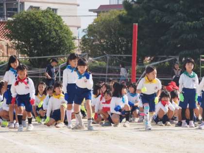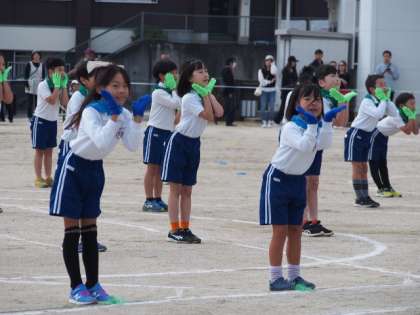 クラスごとに違う色のスカーフと手袋をつけ、「サチアレ」の曲に合わせて、楽しく踊りました。その後、徒競走を笑顔で走り切りました。