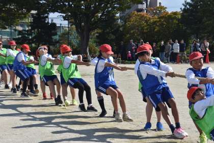 学級対抗綱引きでは、学級全員で息を合わせて綱を引きました。