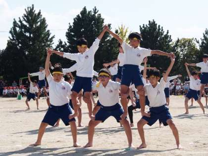 マスゲームの曲の2か所のサビの部分では、2クラスずつ、それぞれ自分たちで考えた表現もありました。