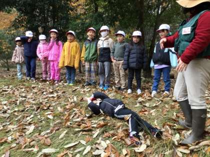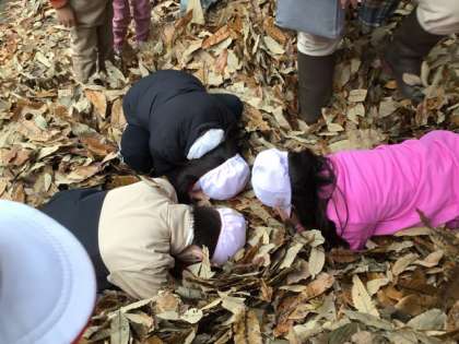 落ち葉を集めたり、落ち葉の坂を転がったりしながら、森の中で、全力で遊びながらいろいろなことを体験し、感じてきました。