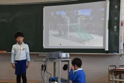 小学校の紹介や、1年生でできるようになったことなどを、学習用タブレットとプロジェクターも使って説明していました。