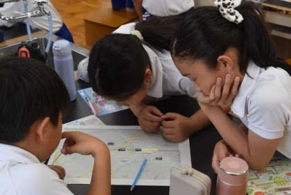 説明やガスメーターの実物から、防災について学びました。そこから、大林地区のハザードマップを作成していきます。