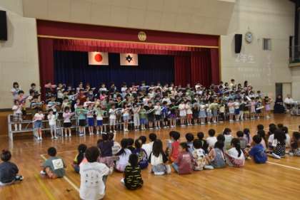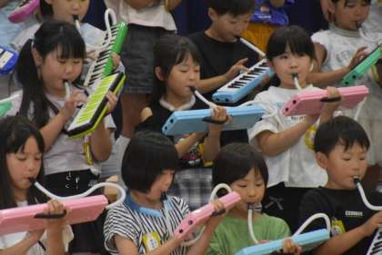 2年生は、鍵盤ハーモニカで「かえるのがっしょう」の演奏と「ドレミのうた」を音の高さを体を使って表現しながら歌いました。
