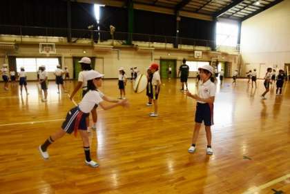 トヨタヴェルブリッツの選手が、大林小学校へきて「タグラグビー教室」を行っていただきました。