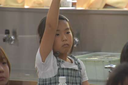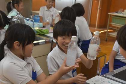 市の下水道課の方から、水道の仕組みを学ました。また、テッシュペーパーとトイレットペーパーを水の入ったペットボトルに入れ、溶け方の違いを実験しました。溶け方が目に見えて違い、子どもたちは驚いていました。